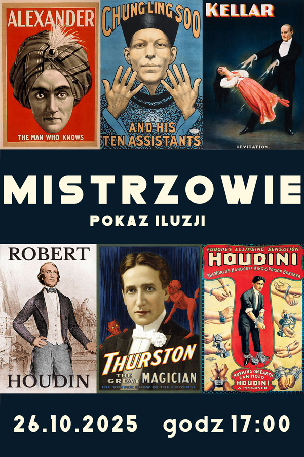 "Mistrzowie" to widowisko pełne nowatorskich oraz klasycznych iluzji, w którym historia magii ożywa na oczach widzów. Podczas pokazu będzie można zobaczyć najprawdopodobniej najstarszy efekt iluzjonistyczny, doświadczyć lewitacji, teleportacji oraz niezwykle rzadko prezentowanej sztuki uwolnień. Całość inspirowana jest historią iluzji i hołduje największym mistrzom tej niezwykłej sztuki. Każdy efekt to opowieść o dawnych magikach, którzy zrewolucjonizowali świat rozrywki i pozostawili po sobie ogromne dziedzictwo. Cechą charakterystyczną pokazu jest to, że widzowie czynnie uczestniczą w nim od samego początku do końca a ich wybory i działania mają kluczowy wpływ na finał całej historii. To spotkanie z iluzją w najlepszym wydaniu, pełne pasji i tajemnicy, dostarczające zarówno emocji, jak i niezapomnianej rozrywki. Pokaz przeznaczony jest dla widzów powyżej 8 roku życia.