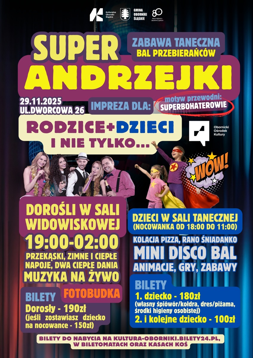 W Obornickim Ośrodku Kultury szykujemy imprezę, jakiej jeszcze nie było! Zapraszamy na SUPER ANDRZEJKI – BAL PRZEBIERAŃCÓW pod motywem przewodnim... SUPERBOHATEROWIE! To wyjątkowe wydarzenie, gdzie każdy znajdzie coś dla siebie. Bawimy się 29 listopada 2025 przy ul. Dworcowej 26! Rodzice i Goście bawią się w sali widowiskowej od 19:00 do 02:00! Czeka na Was: MUZYKA NA ŻYWO do tańca FOTOBUDKA PRZEKĄSKI Dwa ciepłe dania oraz zimne i ciepłe napoje Uwaga! Zapisujac na nocowankę dziecko cena od osoby idzie w dół ze 190 na 150!