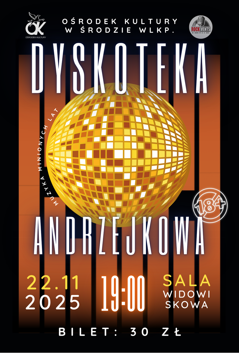 ZAPRASZAMY NA DYSKOTEKĘ ANDRZEJKOWĄ! Data: 22.11.2025 (sobota) Start: 19:00 (Otwarcie drzwi o 18:30) Miejsce: Ośrodek Kultury (ul. 20 Października 30, Środa Wlkp.) Muzyka minionych lat, przygotowana specjalnie na tę okazję! Przygotujcie się na niesamowitą atmosferę i pełen energii wieczór! Dress code: ZŁOTO I CEKINY! Zapraszamy Was serdecznie do wspólnej zabawy, tańców i radosnych chwil przy dźwiękach ulubionych przebojów minionych lat. To idealna okazja, aby uczcić Andrzejki w niezapomniany sposób (w parze albo SOLO)!