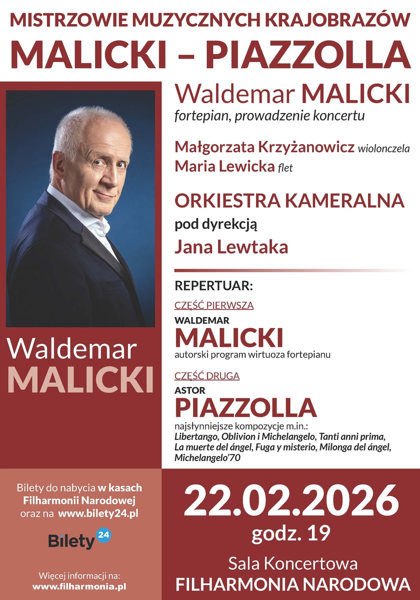 W drugiej części koncertu w świat przepięknych kompozycji Astora Piazzolli, wprowadzi nas Maestro Waldemar Malicki z towarzyszeniem Orkiestry Kameralnej Jana Lewtaka. Usłyszymy m.in.: "Libertango", "Oblivion" i "Michelangelo '70" oraz inne, piękne aranżacje Bernarda Chmielarza.