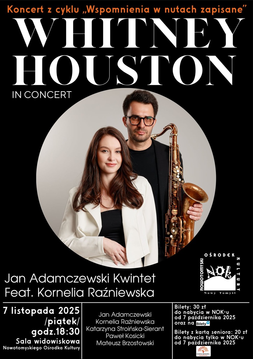 Jan Adamczewski Kwintet feat Kornelia Raźniewska zapraszają Państwa na wyjątkowy koncert z cyklu "Wspomnienia w nutach zapisane", podczas którego zabrzmią najpiękniejsze utwory Whitney Houston w jazzowych aranżacjach.